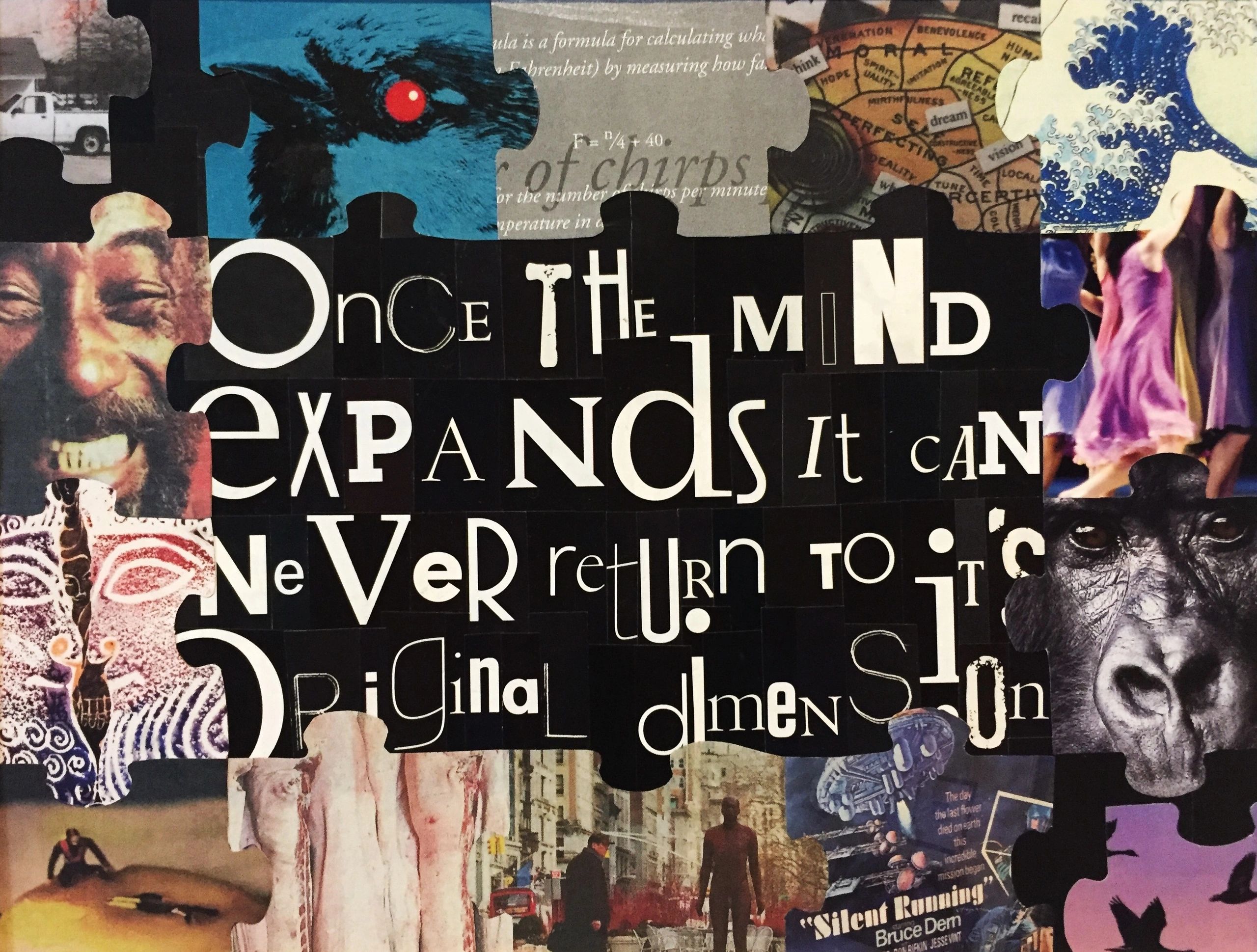 Collage borrows from every visual style, from photographic to graphic design, portraits to patterns, all re imagined from magazines, books, newspapers and leaflets. Relying on the randomness of available materials, it is a journey into the unknown every time an image is found, an idea sketched, and a piece completed.